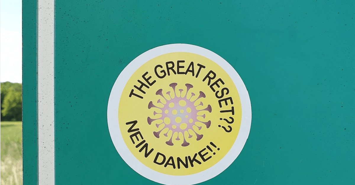 Der Begriff ist inzwischen so weit verbreitet, dass man ihm sogar eines kleben kann. Im Stil der Antiatomkraftsticker heißt es hier Nein zum Great Reset. Mit Virus in der Mitte.