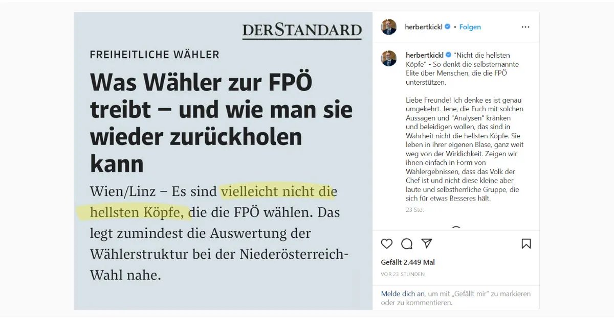 Der freiheitliche Parteichef Herbert Kickl reagierte in einem Beitrag auf Instagram auf die Verhöhnung seiner Wähler durch den Standard. „Liebe Freunde! Ich denke es ist genau umgekehrt. Jene, die Euch mit solchen Aussagen und 'Analysen' kränken und beleidigen wollen, das sind in Wahrheit nicht die hellsten Köpfe. Sie leben in ihrer eigenen Blase, ganz weit weg von der Wirklichkeit. Zeigen wir ihnen einfach in Form von Wahlergebnissen, dass das Volk der Chef ist und nicht diese kleine aber laute und selbstherrliche Gruppe, die sich für etwas Besseres hält“, schreibt Kickl.