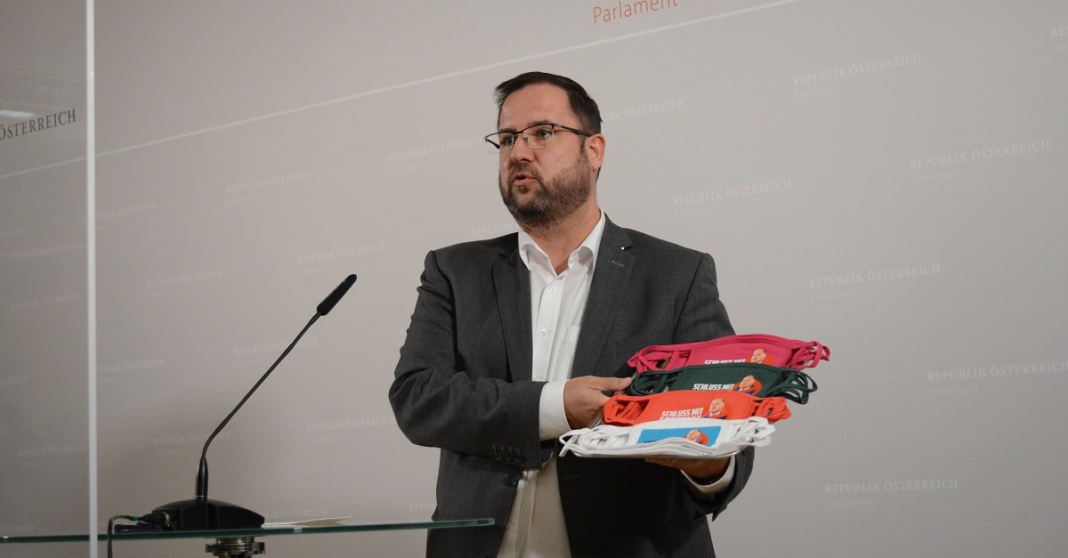 Wien. – Die FPÖ-Fraktion hat heute im „Ibiza“-U-Ausschuss gegen den Vorsitzenden Wolfgang Sobotka protestiert. Am Dienstag trugen deshalb alle Abgeordneten und Mitarbeiter der FPÖ blaue Masken mit der Aufschrift „Schluss mit Sobotage“. Um den überparteilichen Charakter ihres Anliegens zu betonen, brachten die Freiheitlichen auch den anderen Fraktionen Masken in ihrer Parteifarbe mit.